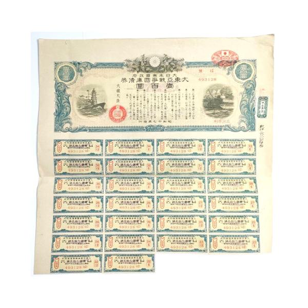 - 美術品・アンティーク・コレクション > コレクション > 【希少】大東亜戦争国債紙券 10円 ×4枚 / 20円 ×3枚 綴じありセット 大日本帝国政府 大東亜戦争国庫債券 壹百圓 100円 郵便局売出加刷付