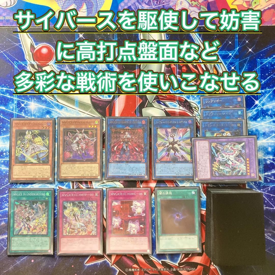 | 商品の特徴 | サイバーファンタジー【M∀LICE】デッキ&EX15&二重スリーブ - メルカリ。サイバーファンタジー【M∀LICE】デッキ&EX15&二重スリーブ サイバー。遊戯王 M∀LICE マリス デッキ メイン41枚+EX15枚 スリーブ付き 遊戯王 M。◆除外空間を支配する本格構築M∀LICEデッキ◆サイバースの除外戦略にM∀LICEのコード書き換え戦術を使いこなせる。ご相談はコメント欄よりお願いいたします。サイバーファンタジー【M∀LICE】デッキ&EX15&二重スリーブ サイバー。高打点に妨害能力を付与して相手を翻弄し圧倒する環境テーマ◆インナースリーブとオーバースリーブの二重スリーブで即実戦仕様☆デッキカスタマイズサービス☆デッキ構成から追加パーツ、スリーブなどカスタマイズを請け負います。遊戯王 初期【メタル化】。✅遊戯王クォーターセンチュリー アートコレクション未開封3BOX。即購入OK#かしこま遊戯王デッキ#かしこま遊戯王環境デッキ#かしこま遊戯王M∀LICEデッキ ■モンスター 3枚 M∀LICE<P>Cheshire Cat2枚 M∀LICE<P>Dormouse1枚 M∀LICE<P>White Rabbit1枚 ドット・スケーパー2枚 ディメンション・アトラクター1枚 深淵の獣ドルイドヴルム1枚 深淵の獣バルドレイク1枚 深淵の獣サロニール3枚 テンプレート・スキッパー3枚 パラレルエクシード1枚 EM:Pグレニャード1枚 妖精伝姫-シラユキ1枚 孤高除獣 ■魔法 2枚 M∀LICE IN UNDERGROUND3枚 闇の誘惑2枚 封印の黄金櫃2枚 サイバネット・マイニング2枚 墓穴の指名者 1枚 ワン・フォー・ワン1枚 テラ・フォーミング ■罠2枚 M∀LICE<C>TB-112枚 M∀LICE<C>GWC-062枚 M∀LICE<C>MTP-07 ■エクストラ2枚 M∀LICE<Q>HEARTS OF CRYPTER2枚 M∀LICE<Q>WHITE BINDER2枚 M∀LICE<Q>RED RANSOM1枚 リングリボー1枚 盛悴のリザルドーズ1枚 スプラッシュ・メイジ1枚 トランスコード・トーカー1枚 トポロジック・ゼロヴォロス1枚 アクセスコード・トーカー1枚 ファイアウォール・ドラゴン1枚 ファイアウォール・ドラゴン・ダークフルード-ネオテンペスト1枚 サイバース・ディセーブルムマリスMALICE種別...複数カード | ||