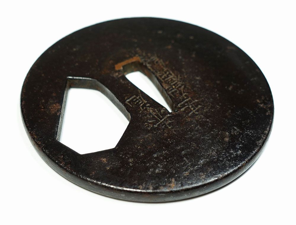 - 美術品・アンティーク・コレクション > 武具 > 鉄地丸形大透鐔 在銘 赤尾甚左衛門尉作 角耳 羊羹色 越前松平家抱工 桐箱入 鉄地丸形大透鐔 在銘 赤尾甚左衛門尉作 角耳 羊羹色 越前松平家抱工 桐