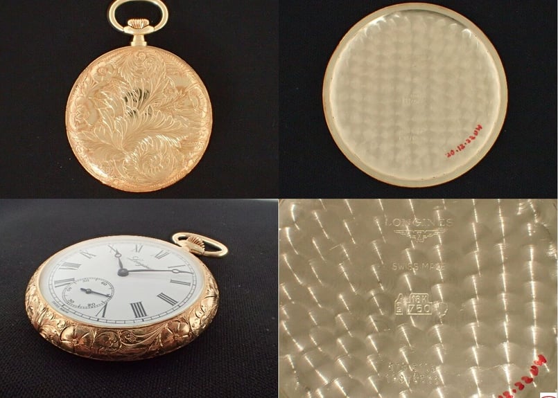 18K金無垢ケース アンティーク懐中時計 豪華彫金 /本体31.35g /不動品 AV-26B ロンジン LONGINES K18YG彫金ケース Cal.878.4 懐中時計