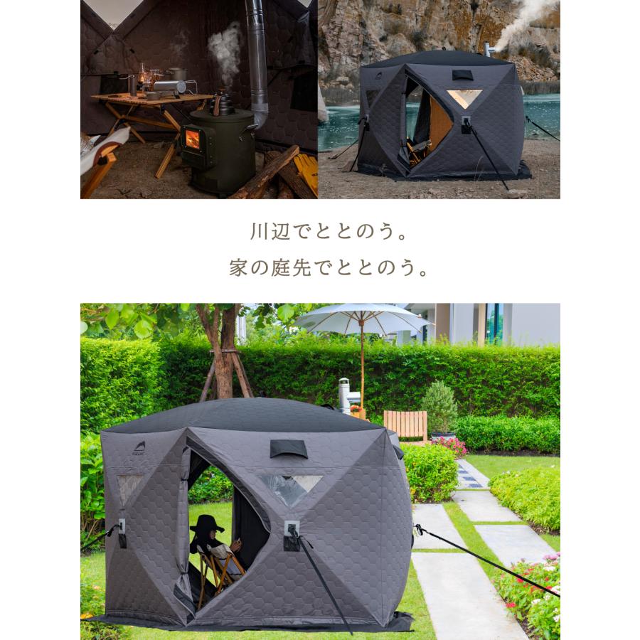 - アウトドア > テント・タープ > ☆試運転のみ美品☆ テントサウナ フルセット 総額14万円相当 整いチェア付 サウナテント 本体 大型 7人用 工具必要なし 五角形 テント サウナ 薪