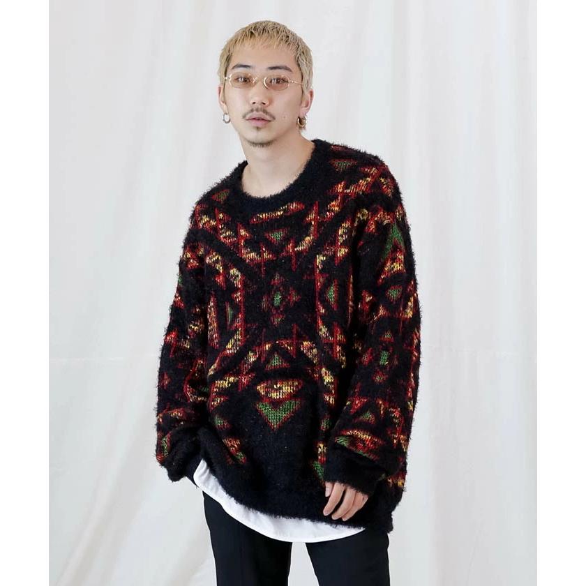 メンズウェア COLORFUL GEOMETRY PATTERN JQD KNIT CREW Iroquois(イロコイ) ニット 3G WJQ GEOMETRIC PATTERN KNIT 黒