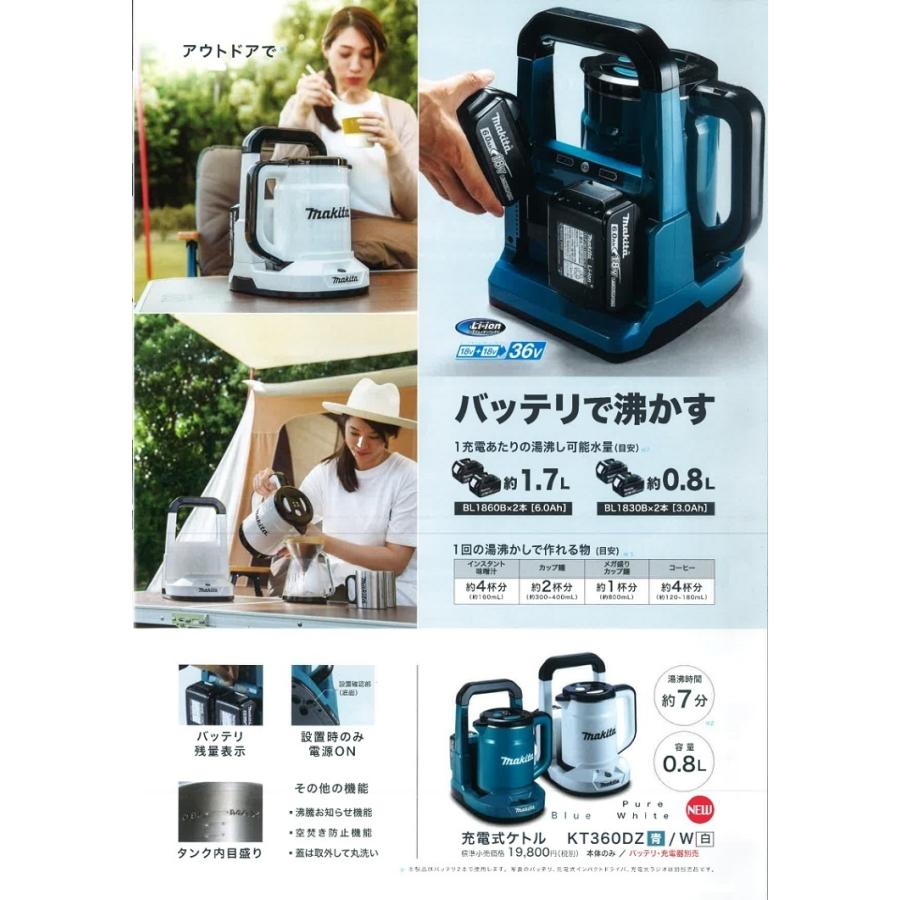 | 商品の特徴 | マキタ(makita) マキタ電動工具 充電式ケトル KT360DZ 18V+18V=36V。Amazon.co.jp: マキタ(Makita) 充電式ケトル 36V バッテリ・充電器別売。マキタ KT360DZ 充電式ケトル(青) 18V+18V対応 (本体のみ) バッテリ。メーカー名makita マキタ商品名充電式ケトル【KT360DZ・KT360DZW】18V×2本=36V容量 0.8L湯沸かし所要時間 約7分電源直流36V(18V×2)本機寸法(長さ×幅×高さmm)233×263×307容量0.8L湯沸し所要時間約7分質量(kg)3.3(全体)1.0(台座)1.0(ケトル)箱は開封済みですが未使用品です。。マキタ(makita) 充電式ケトル 青 本体のみ makita KT360DZ バッテリ | ||