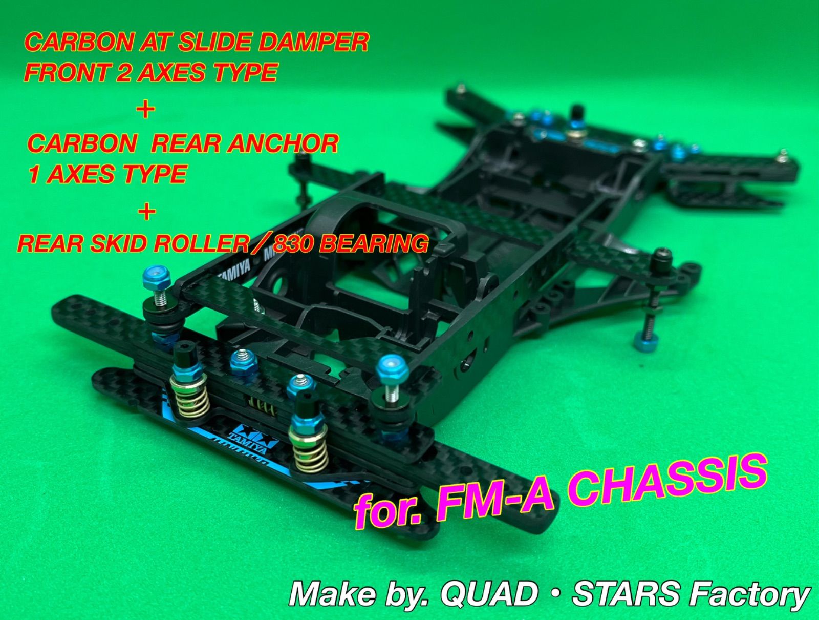 | 商品の特徴 | ミニ四駆・MS用】2軸ATスラダン+フロント提灯+1軸アンカー+。ミニ四駆・MSシャーシ用】2軸ATスラダン+フロント提灯+1軸リヤ。ミニ四駆・MS用】2軸ATスラダン+フロント提灯+1軸アンカー+。☀️お得な【まとめ買い申請】募集中☀️⚠️こちらのカーボンユニットは、ミニ四駆のセットアップにある程度慣れた【中級〜上級者向け】のカスタムパーツです⚠️◉2軸ATスライドダンパーのレシピ・リヤブレーキステー/J-CUP2021 ×1・直カーボン ×4・マルチ補強プレート ×1・マルチ強化プレート ×1【スライドダンパー用スプリング(4種類付属)】◾️スライド部分:ミディアム/ゴールド ×1◾️2軸部分: ミディアム/ゴールド ×2【交換用】◾️ソフト/ブラック ×3◾️ハード/シルバー ×3◾️スーパーハード/シルバーメッキ ×3◉フロント提灯のレシピ・マルチ補強プレート ×4・丸頭ビス/2×20mm ×2・アルミスペーサー/1.5mm ×2⚫︎フロントユニットの重さ:約16.8g※フロント提灯含む◉1軸リヤアンカー/19mmローラー対応のレシピ・リヤブレーキステー/J-CUP2021 ×1・マルチワイドリヤステー/J-CUP2024 ×2・直カーボン×3・キャップスクリュー/2×20.3mm ×1◉ローラーアンダーガード・リヤブレーキステー ×2・アルミスペーサー/3mm ×4◉リヤスキッドローラー・リヤブレーキステー/J-CUP2021 ×1・830ベアリング/AO-1008 ×2・両軸モーターピン ×1【ダンガン用タルバネ(2種類付属)】◾️1軸部分:シルバー/ハード ×1【交換用】◾️ブラック/ソフト ×1⚫︎リヤユニットの重さ:約17.3g【追加オプション】①FRPお辞儀防止プレート/TYPE-A&TYPE-Bセット 2,498円 ②FRPお辞儀防止プレート(単品) 各1,298円✅その他のご要望も【コメント欄】から承ります^ ^↓↓よろしければ他にも出品していますのでこちらも併せてご覧ください↓↓#QUAD・STARS/MSシャーシの商品一覧はこちら#QUAD・STARS/カーボンの商品一覧はこちら↑↑タップでミニ四駆のみの見やすいページに飛びます↑↑【ご案内】⚫︎タミヤ純正パーツのみを取り扱っておりますので、公式レースでも安心してご利用いただけます。ミニ四駆・MS用】2軸ATスラダン+1軸リヤアンカー+リヤスキッド カーボン。⚫︎カーボンユニット以外は別売ですm(_ _)m | ||