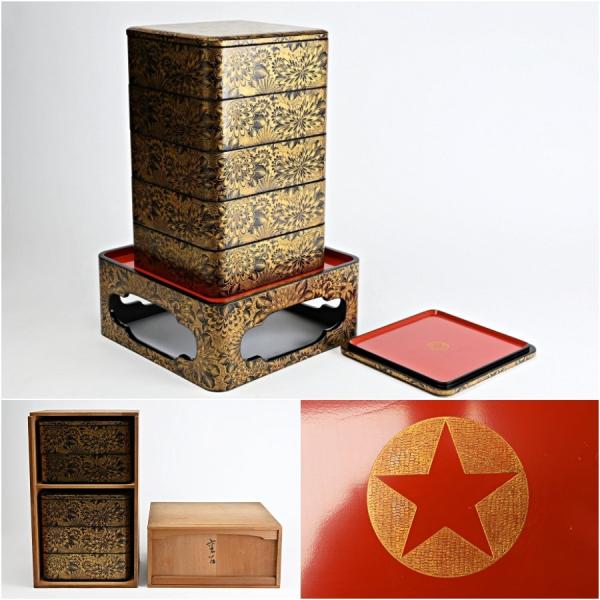 輪島塗風 総沈金菊彫 木製漆塗 大型重箱 内朱 アンティーク 重箱 おせち用 輪島塗 総沈金彫 菊花文尽 五段重 重箱 重台付 : 古美術久田 - 通販
